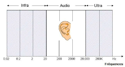 En dessous de 20 Hz, il s’agit d’infrasons et d’ultrasons au dessus de 20 KHz. Ceux- ci ne donnent pas lieu à une sensation sonore.