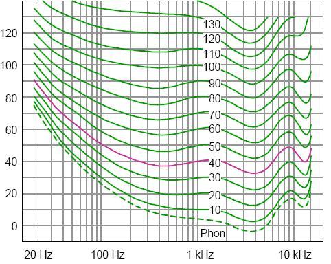Prenons un exemple : si vous prenez comme référence un signal à 1 KHz émis à un niveau de 60 dB, et que vous le comparez à un signal de 40 Hz, ce dernier devra être d’un niveau non plus de 60 dB mais de 80 dB pour que vous ayez une sensation sonore identique. Si vous comparez ensuite ce même signal à 1 KHz avec un autre à 8 KHz, ce dernier devra être émis à un niveau de 70 dB pour que vous ayez une sensation sonore identique pour les deux signaux.
