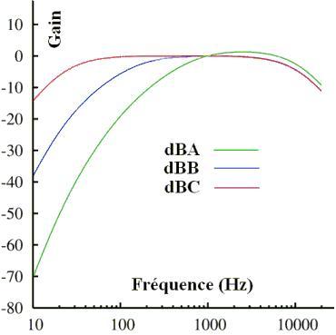 dB(A), dB(B), dB(C) : Afin de faire correspondre aux mieux les mesures, des courbes de pondérations ont été créées. Ces pondérations vont permettre de tenir compte approximativement de la variation de la sensibilité de l’oreille en fonction de la fréquence et de l’intensité.