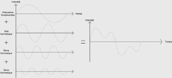 Chaque son est formé d’une fréquence fondamentale et de fréquences harmoniques”. On dit qu’un son est riche, agréable à entendre, lorsqu’il contient de nombreuses harmoniques. Un son pauvre en harmoniques paraîtra terne à notre oreille. Un son ne comprenant qu’une seule fréquence est appelé “son pur” (extrêmement rare dans notre environnement quotidien). Les sons musicaux sont des “sons complexes”, mélanges de sons graves et aigus. Le son musical est la superposition d’un son fondamental et d’harmoniques dont les fréquences sont des multiples de la fréquence fondamentale.