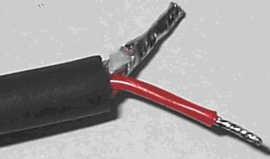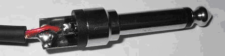 Du côté de la fiche jack, le principe est différent. En effet, vous remarquez que le conducteur du point froid a été dénudé sur une plus grande longueur. Celui- ci sera torsadé et étamé avec la masse (deuxième photo).