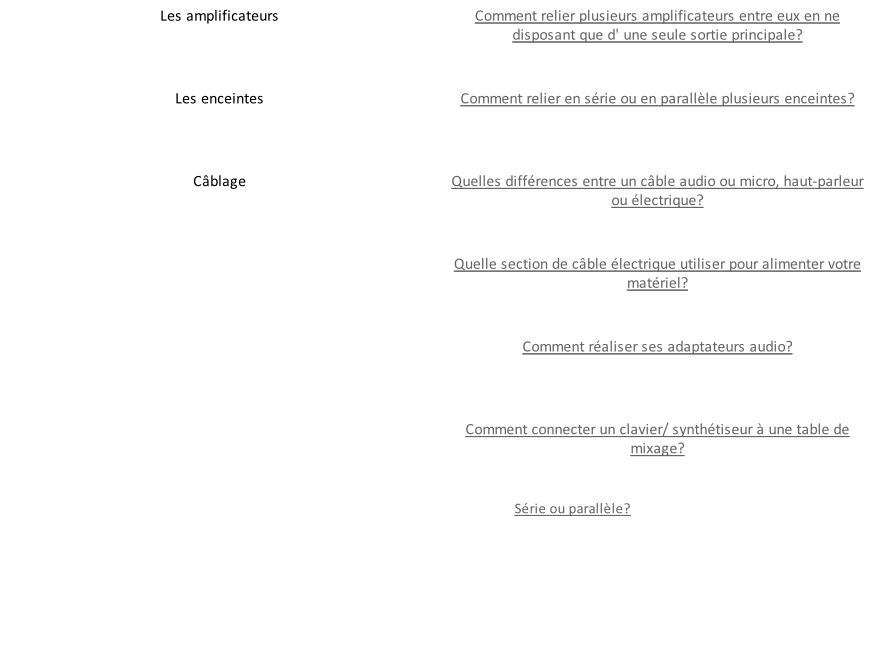 Cette rubrique est née suite à de nombreuses questions posées par les novices du monde la sonorisation. Elle leur est entièrement destinée ainsi qu' aux techniciens désirant se rafraîchir éventuellement la mémoire.