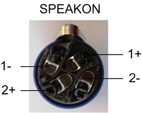 Les Speakon à 4 contacts possèdent les contacts 1+, 1- et 2+, 2-.