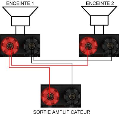 Le cas est simple : un câble provient de l’amplificateur et arrive dans la première enceinte. Un autre câble est utilisé pour repartir de cette même enceinte vers la deuxième.