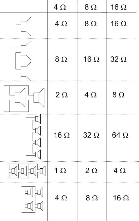 Exemple : Un amplificateur dont l’impédance de charge minimale est de 4 ohms ne pourra accepter un groupement d’enceintes dont l’impédance équivalente est de 2 ohms. Cet amplificateur pourra par contre accepter une charge dont l’impédance est de 4 ohms ou plus.