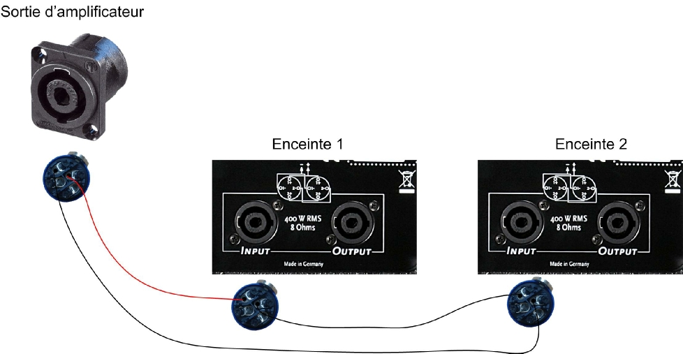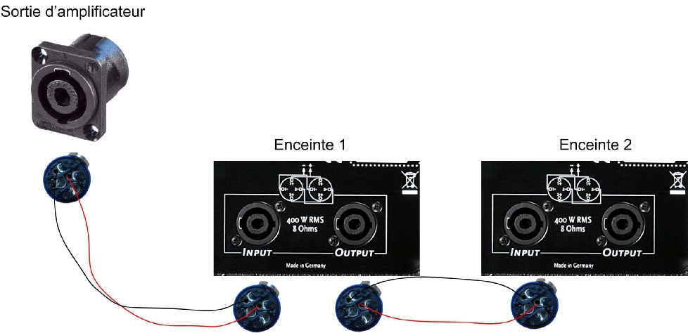 On peut donc relier plusieurs enceintes en parallèle de cette façon :