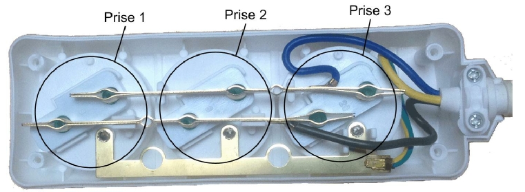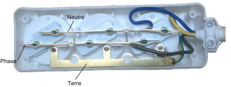 Là aussi, il s’agit bien sûr d’une mise en parallèle des trois prises. A chaque prise, le câblage est le suivant :