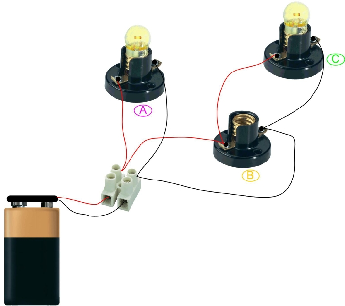 Troisième situation : Trois soquets sont branchés en parallèle. Le fait que la lampe B soit absente n’empêche pas les deux autres d’être allumées.