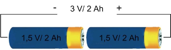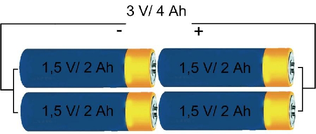 Il est bien sûr possible de combiner mise en parallèle et mise en série afin d’obtenir une tension et une puissance plus élevée. Ici, on obtient 3V et 4 Ah.