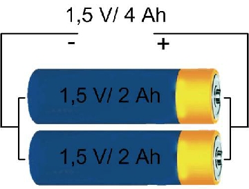 Ici, les piles sont placées en parallèle. La tension résultante est identique à celle d’une pile : 1,5 V. Par contre, l’intensité maintenant disponible est de 4 Ah.