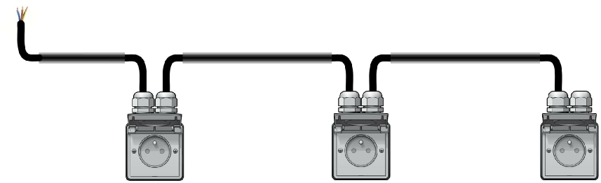 Si ces prises avaient été raccordées en série, il aurait fallu brancher une ampoule par prise pour que cela fonctionne. Et du coup, la tension aurait été divisée comme nous l’avons vu au point 4.