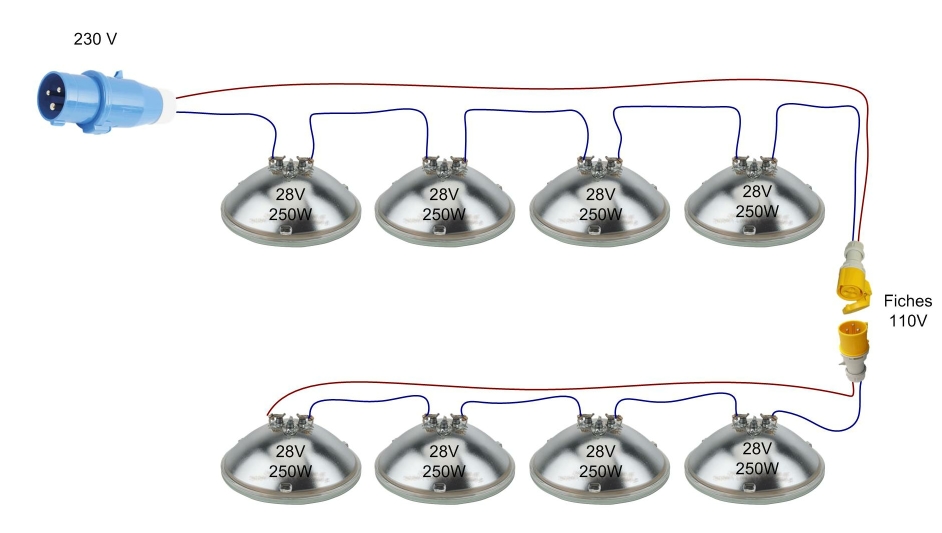 On va donc placer deux groupes de quatre ampoules en série afin de pouvoir alimenter l’ensemble en 230 volts.