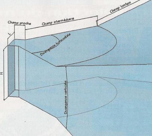 Le champ intermédiaire est donc un tronçon de cylindre de hauteur H et de rayon R. Soit R = H²F/680. Les valeurs limites à -6 dB sont données par l’angle de divergence horizontal du champ lointain soit 1,22 λ/L ou 1,22 λ/H.
