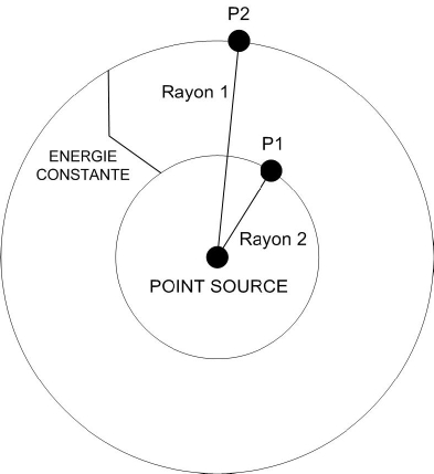 Prenons deux sphères concentriques dont le centre est notre point source. L’énergie est constante sur chacune de ces sphères dont on connait la surface (S= 4πR²). Appelons cette énergie E. Prenons un point P sur chaque sphère.