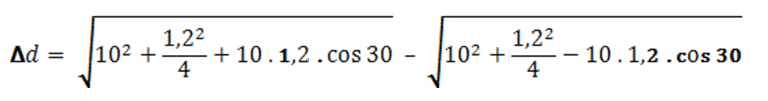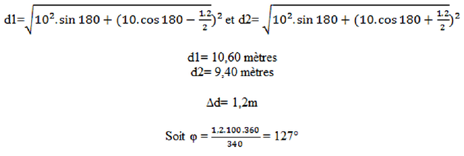 Pour un angle de 90°, la distance d1 est de 10,02 m. d2 est de 10,02 m + 1,2 soit 11,22 m. La différence est de 1,2 m. Cela correspond à un déphasage de 180°.