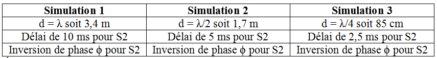 Le délai appliqué à S2 est de 3,5 ms, correspondant à la distance d (ou D= T x 340 soit D= 0,0035 x 340 = 1,2 mètres).