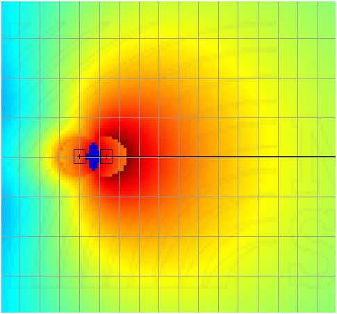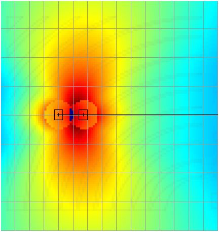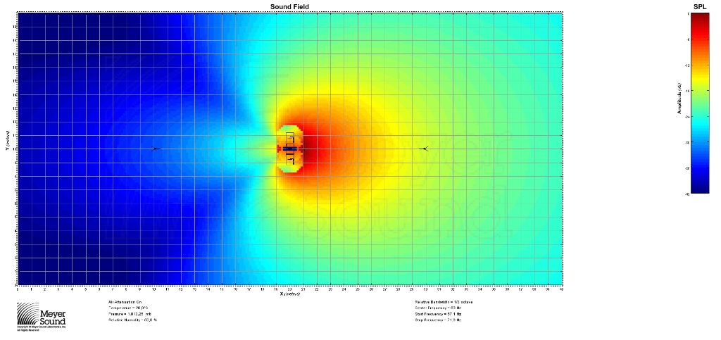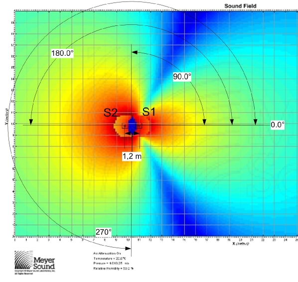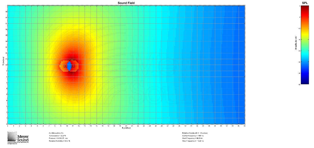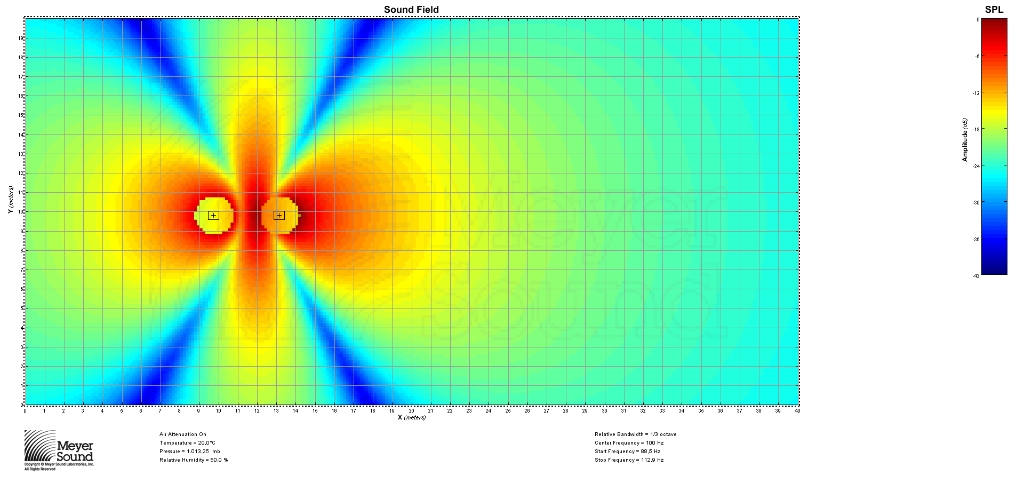On peut également effectuer une vérification en réalisant une simulation via Mapp Online de Meyer. Les sources sont des subs 500HP, l’écart est bien de 1,2 m entre-elles et la fréquence de simulation est de 100 Hz.