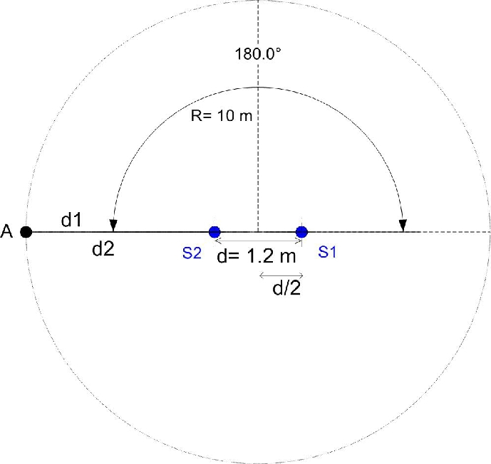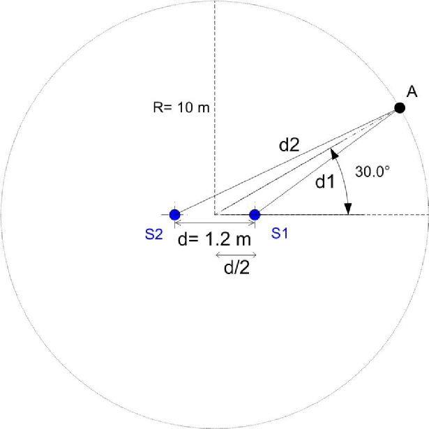 Et nous choisirons arbitrairement les valeurs suivantes : Le rayon du cercle est de 10 mètres, la distance séparant les deux sources est de 1,2 m. L’angle est de 30°.