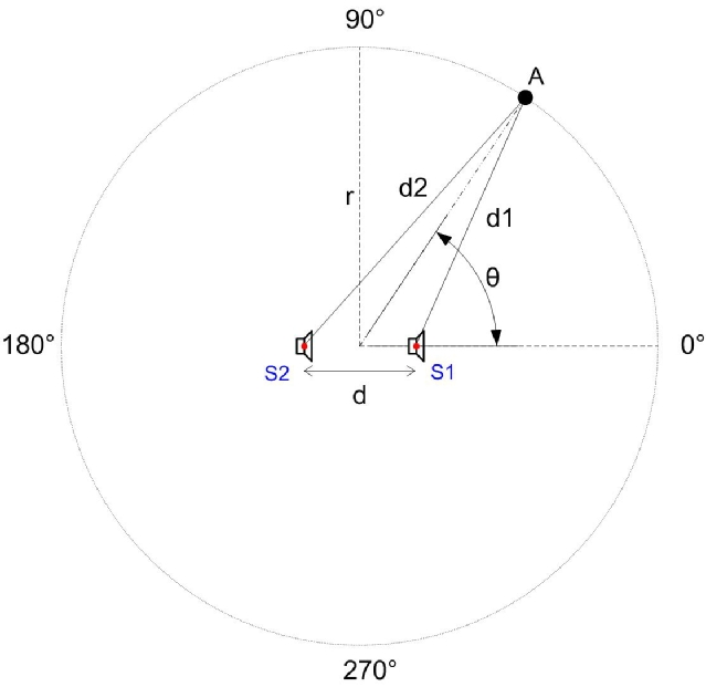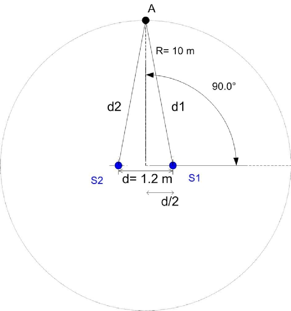Ces distances d1 et d2 seront donc variables par rapport à la place de notre auditeur (angle et distance) et de la distance d qui sépare nos deux sources.