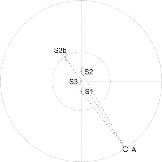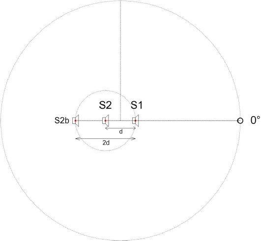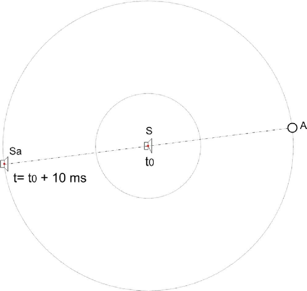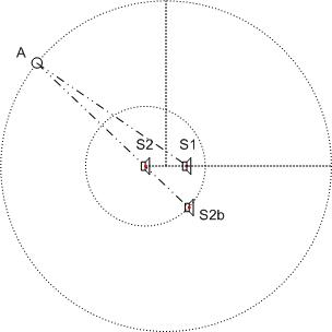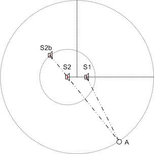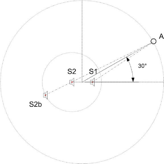La source sonore retardée S2 se déplacera donc virtuellement (pour se trouver en S2b) en fonction de la place de l’auditeur, alors que la source S1 restera au même endroit.