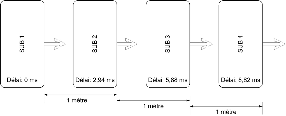 Exemple : Nos subs sont espacés d’un mètre, le délai appliqué au deuxième sub est de 2,94 ms, 5,88 ms au sub 3 et 8,82 ms au sub 4.