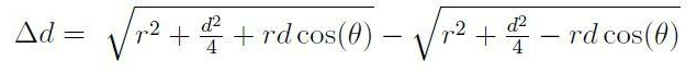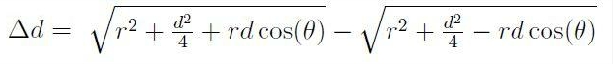 Notre but est calculer la différence de distance (∆d) entre d1 et d2, afin de traduire cette valeur en degrés, correspondant à un déphasage φ, déphasage dépendant de la fréquence et de la distance séparant les centres acoustiques de ces sources.