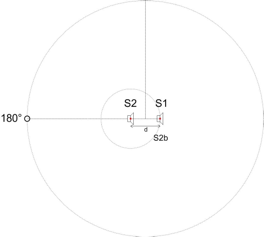 La situation est donc la suivante : Le sub S2 est éloigné physiquement du sub S1 de 85 cm dans notre cas. Il est également éloigné temporellement de 2,5 ms, il se retrouve donc virtuellement à l’emplacement S2b.