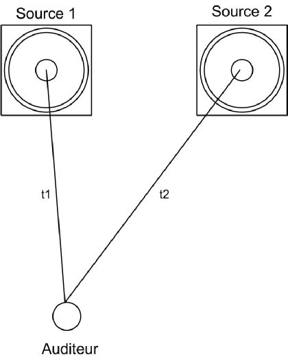 Prenons trois situations classiques et courantes. Dans la première, un auditeur va recevoir avec une différence de temps les sources 1 et 2 qui émettent le même signal.