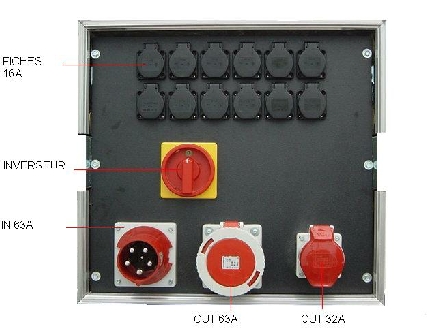 Ce type de tableau est des plus classique. Il est tout à fait possible d’ajouter une ou deux (ou plus) prises triphasées qui permettraient le branchement d’un autre tableau en parallèle avec le premier. Dans ce cas, ces prises sont également protégées par un disjoncteur tétra polaire. C’est le cas sur le tableau ci- dessus.