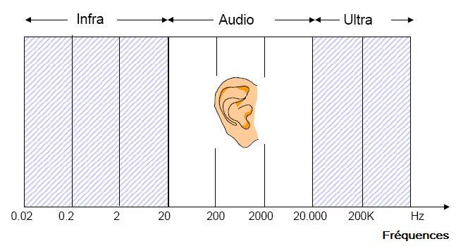 En dessous de 20 Hz, il s’agit d’infrasons et d’ultrasons au dessus de 20 KHz. Ceux- ci ne donnent pas lieu à une sensation sonore.