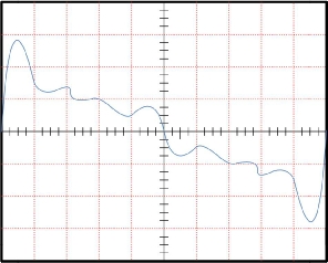 Voici maintenant le même son mais visualisé sur un oscilloscope. Le fait qu’il s’agit d’un son complexe est bien visible.
